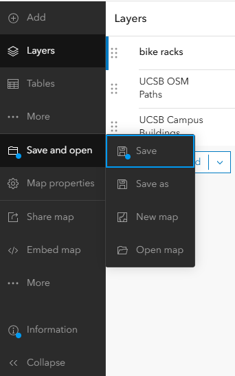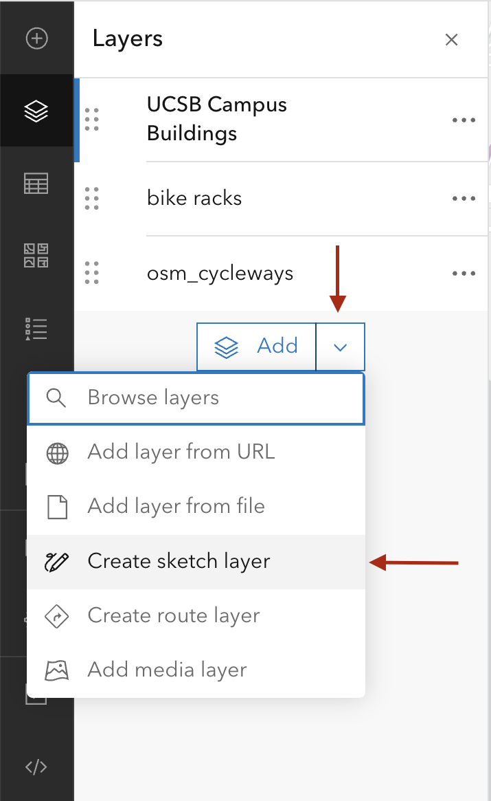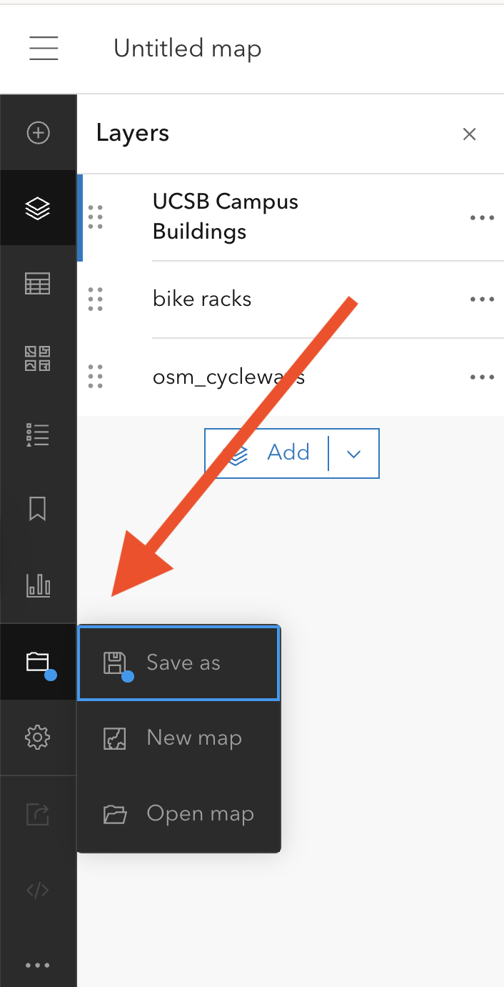 In the Map Viewer there is a menu bar in the left column. This is where you can add components to your map. The way to think about a map is that it is made of different layers that are added on top of each others. Each layer add a specific information to your map. In our example, we will have a layer for the bike paths, one for the bike racks, one for the buildings, and so on… The base layer is special and often made of an image (but does not have to be). It is called a ‘basemap’. Here are the main components of your map: