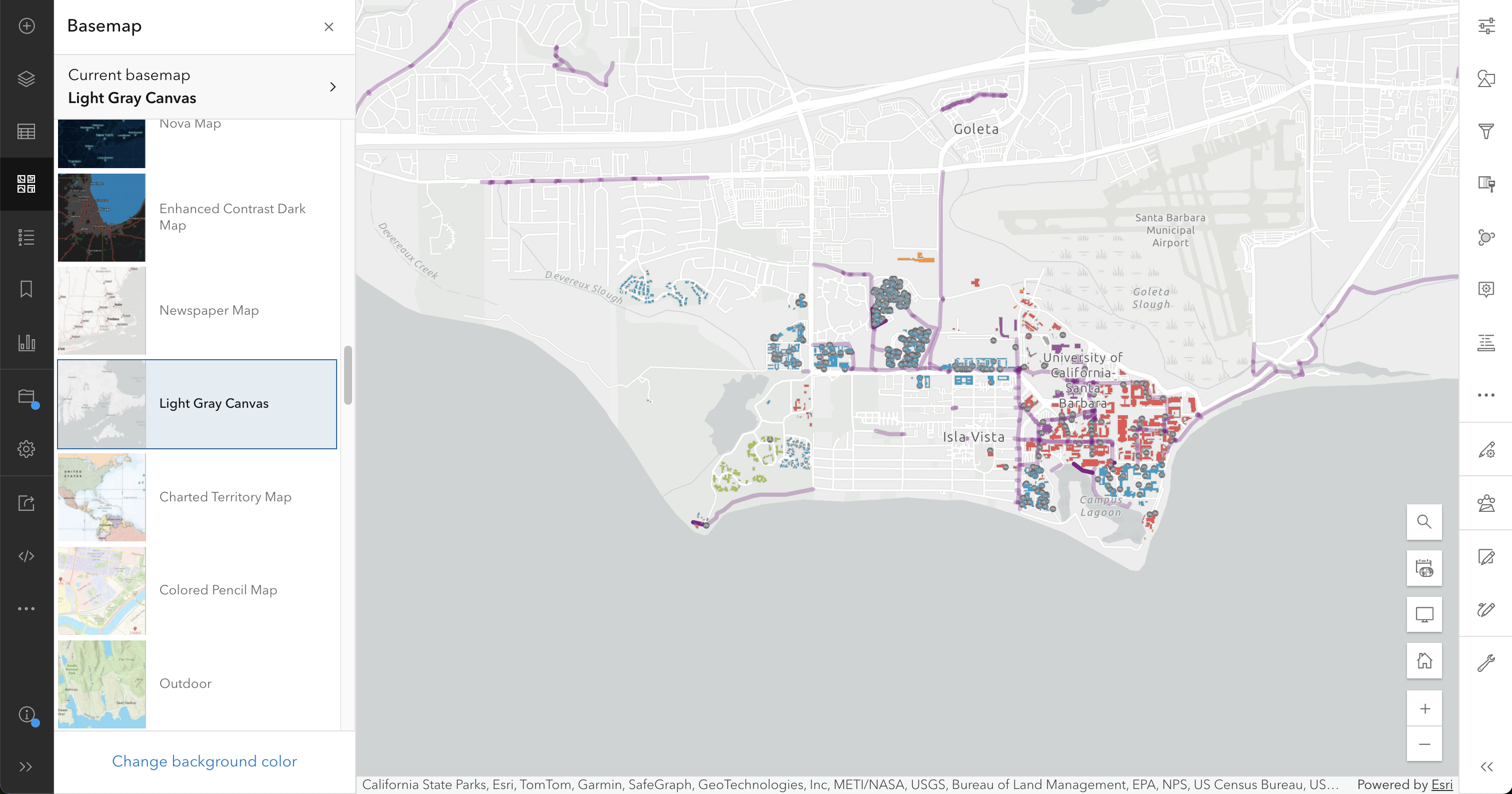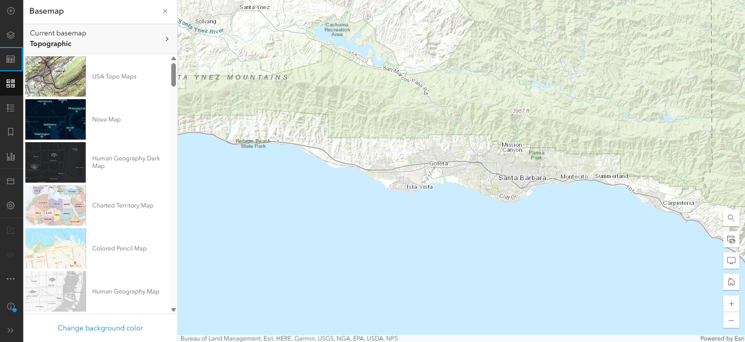 After adding the layers and customizing their symbology, we have a good, almost ready map. However, the current basemap (Topographic) is a bit too busy and makes it hard to see the features we added. Let’s change it to a simpler basemap using the Basemap option in the left menu bar.