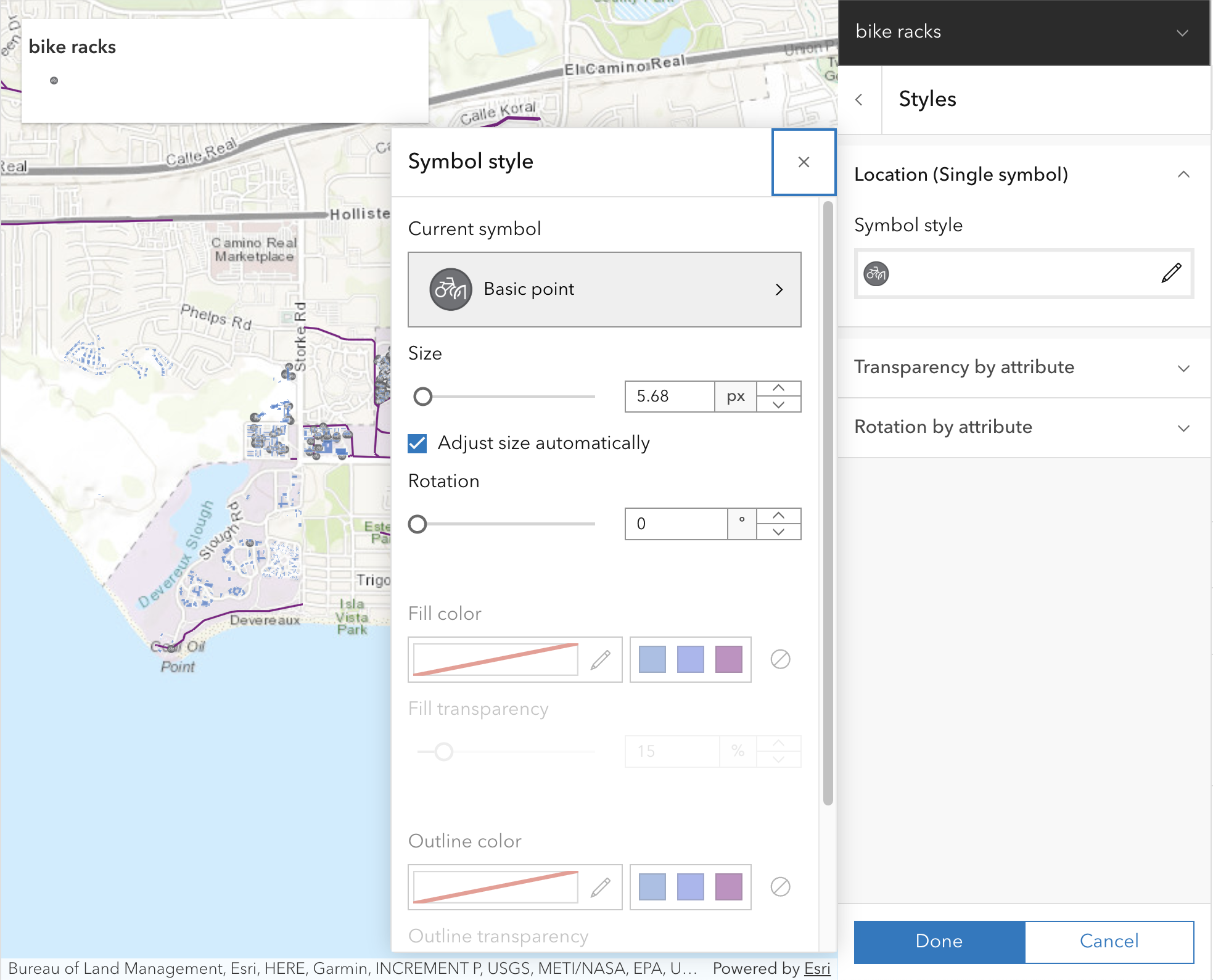 To change the size of the symbol, we can use the Size slider to reduce it to a more appropriate size. First, select “Adjust size automatically” to ensure the symbols to scale as you zoom in and out of the map. Then, you can use a custom size by moving the slider or entering a value; in our case, we selected 5.68 px.
