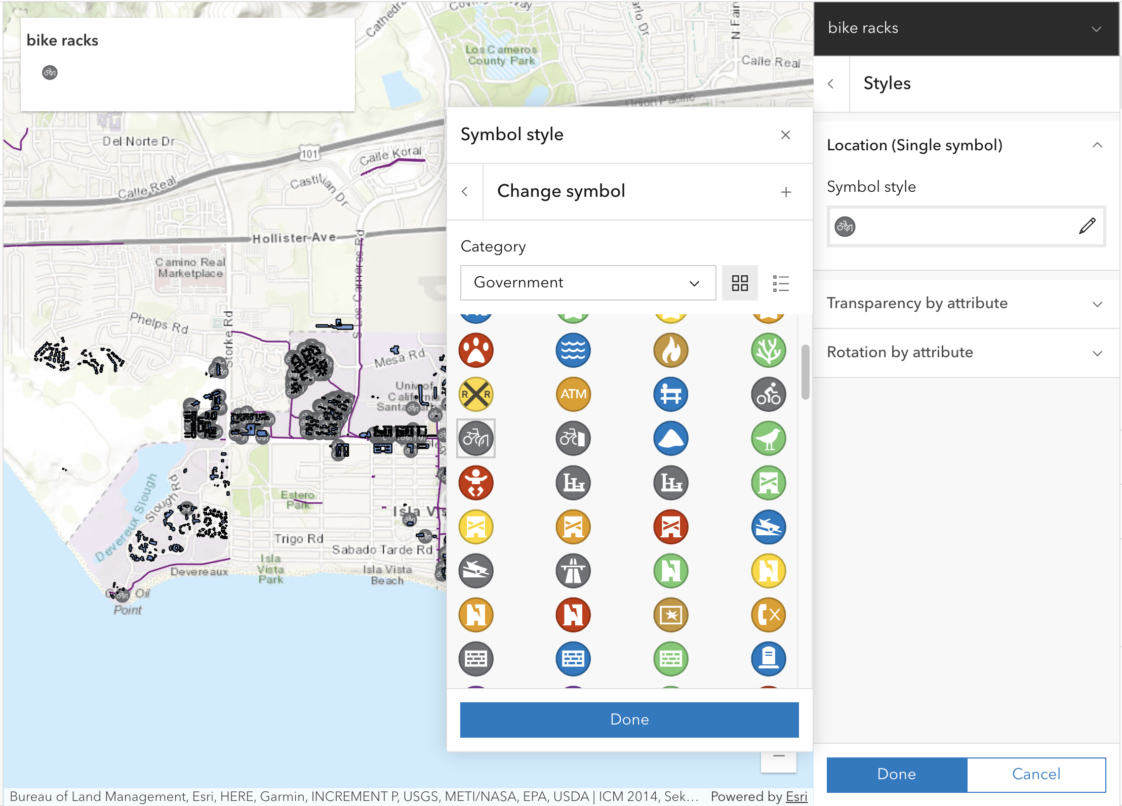 From the menu, we can select several categories of symbols. Let’s select the Government category and look for a bike parking icon. Click on the Done button to apply the changes and return to the symbol style panel.