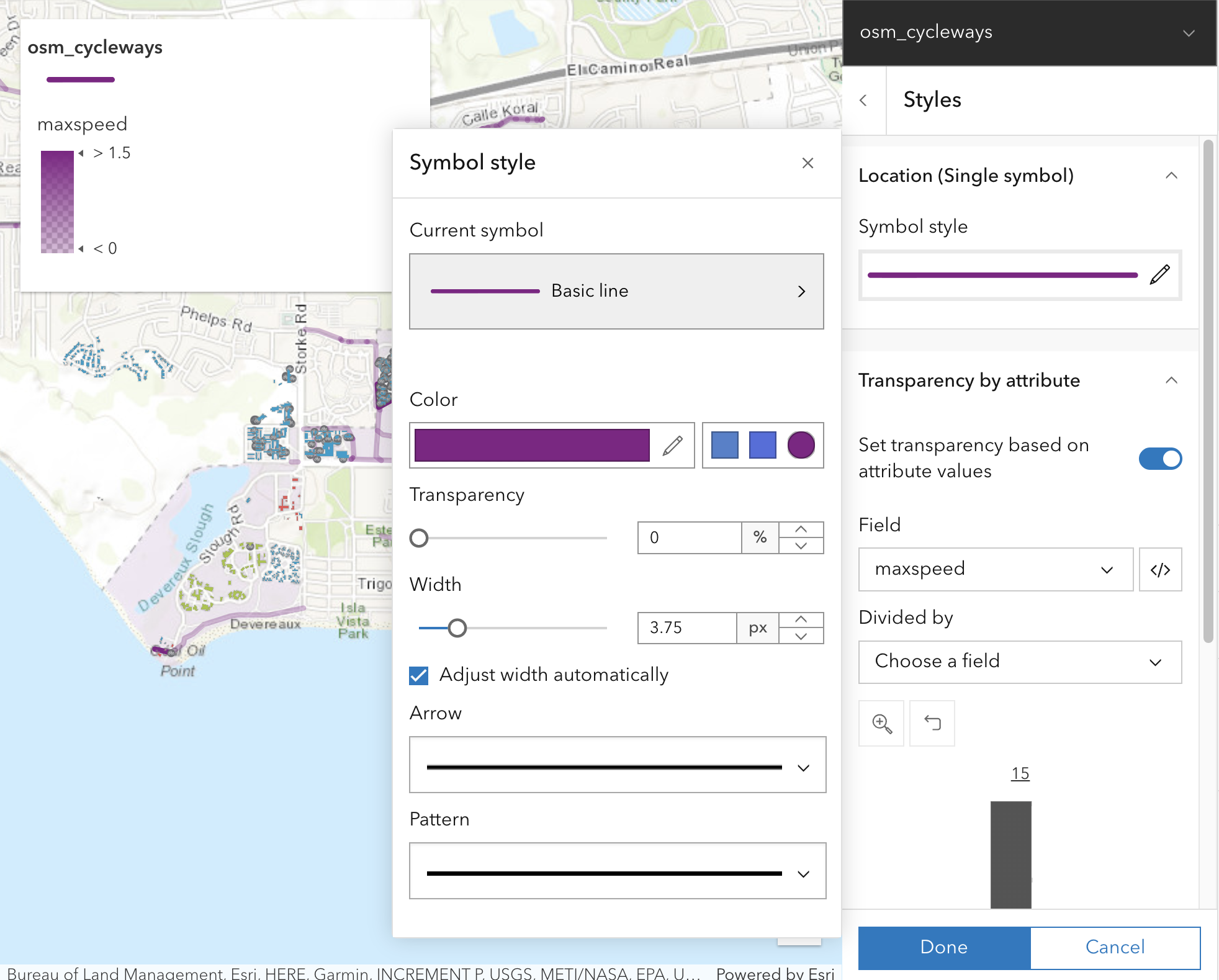 To increase the visibility of the bike paths, we can increase the width of the lines by editing the Width slider on the Symbol style panel. We selected 3.75 px for this example.