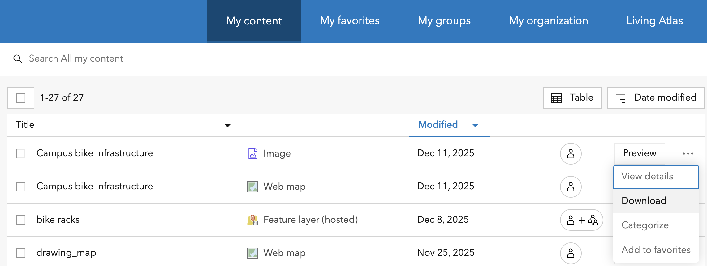 Gallerycontains items from our ‘featured content’ group Groupsare a list of groups which you can create or join. Some are invitation only. These are popular when you are working in group projects. For this workshop, we have created a group called From Maps to Analysis which contains most of the data layers we will be using.Contentis where your created or uploaded content is listed. You can make folders in here to organize your layers and features.Notebooksis ESRI’s version of a Jupyterhub-like environment. You can use ArcPy here. This may not be available to you based on your user role.Organizationwill take you back to our main page. This is not the same as Home.Scene, orScene Vieweris where you can create 3D GIS scenes, such as neighborhood models and digital twins.Map, orMap Vieweris where you can create 2D maps. We will be focusing on using the Map Viewer for this workshop.