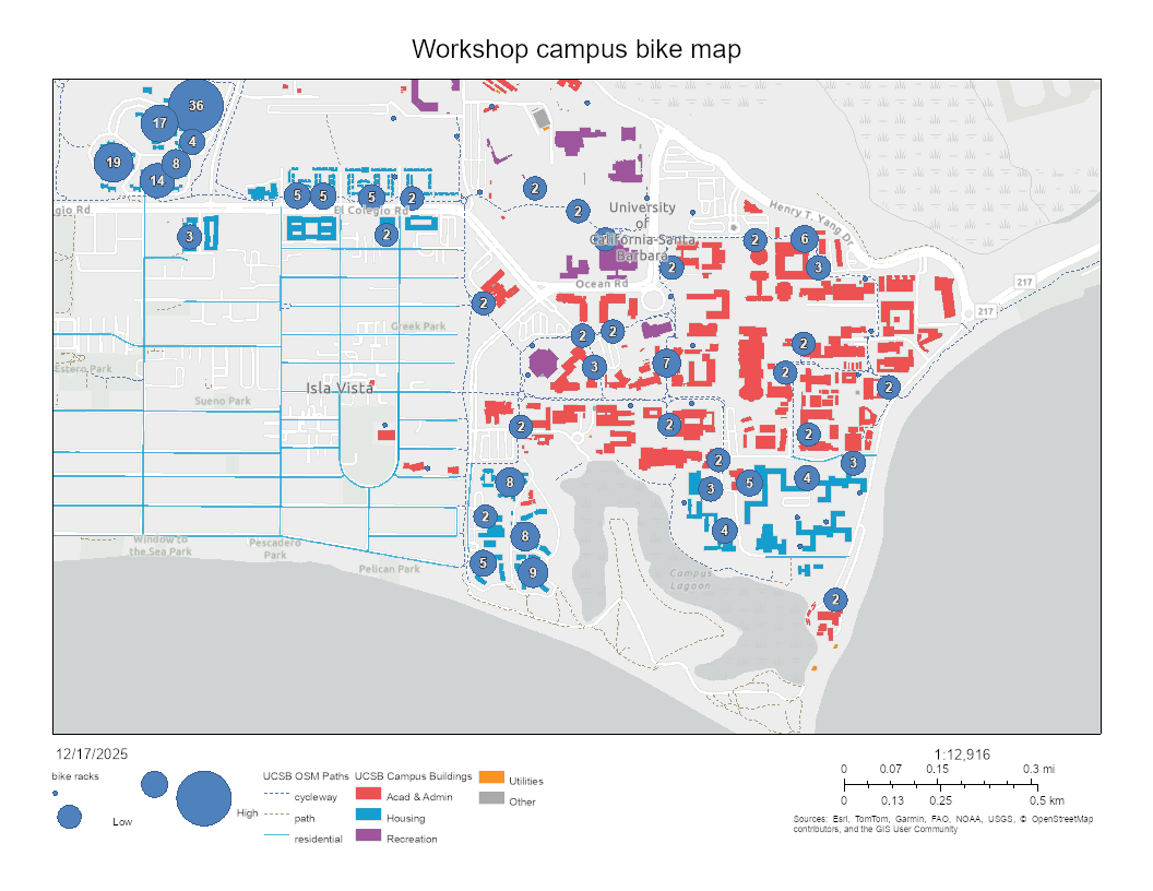 The goal of this lesson is to demonstrate how to make a simple map, suitable for inclusion in a publication, using ArcGIS Online. As an exercise, you will be creating a map that reflects your personal experience biking on the UCSB campus. We will follow a typical workflow of:
