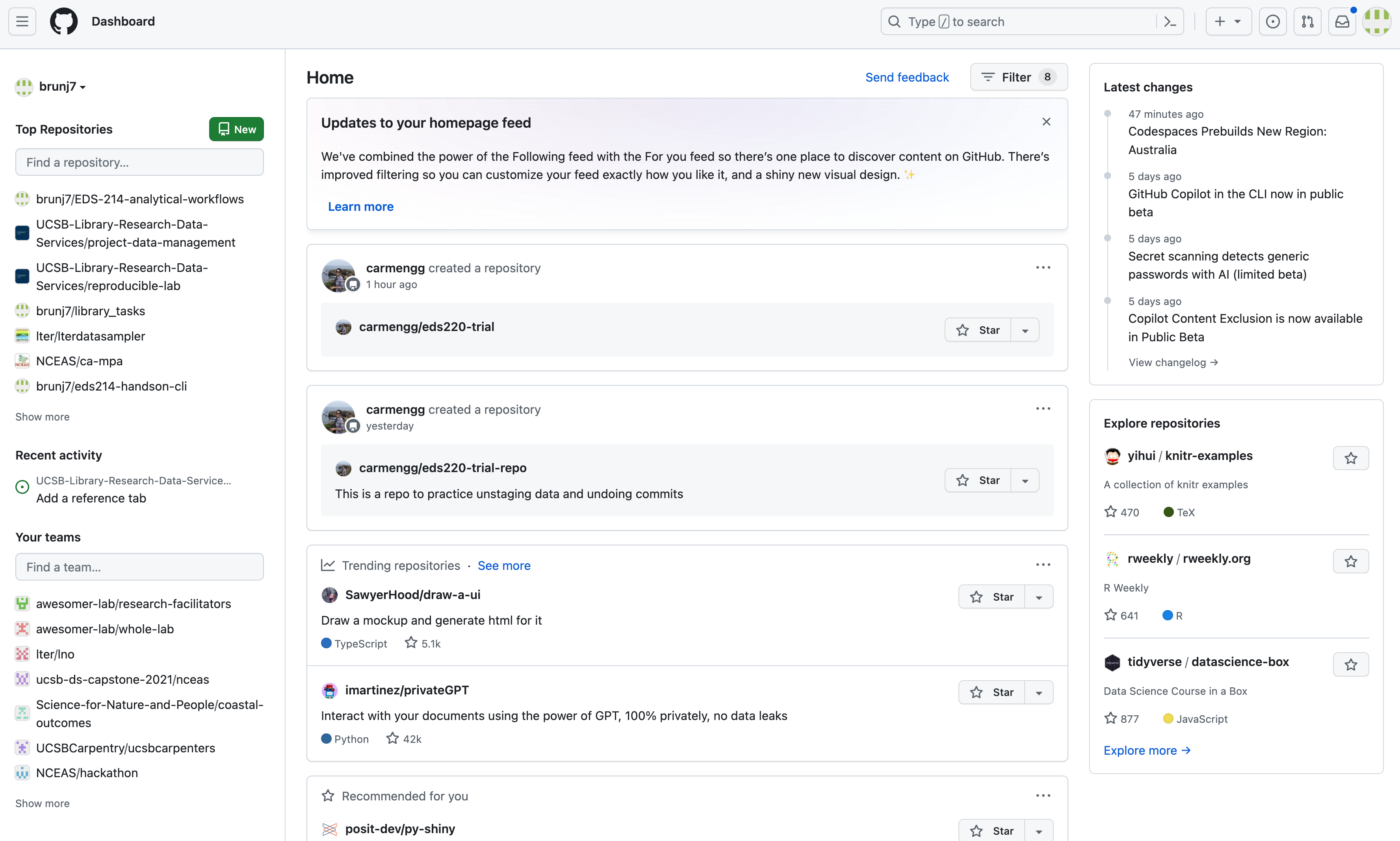 This is the default landing page when you log into your account. It provides a mix of the most recent resources and activities of your and your collaborators’ actions, as well as some resources relevant to your work. The dashboard therefore changes on a regular basis. Once logged in, you can access your dashboard at https://github.com