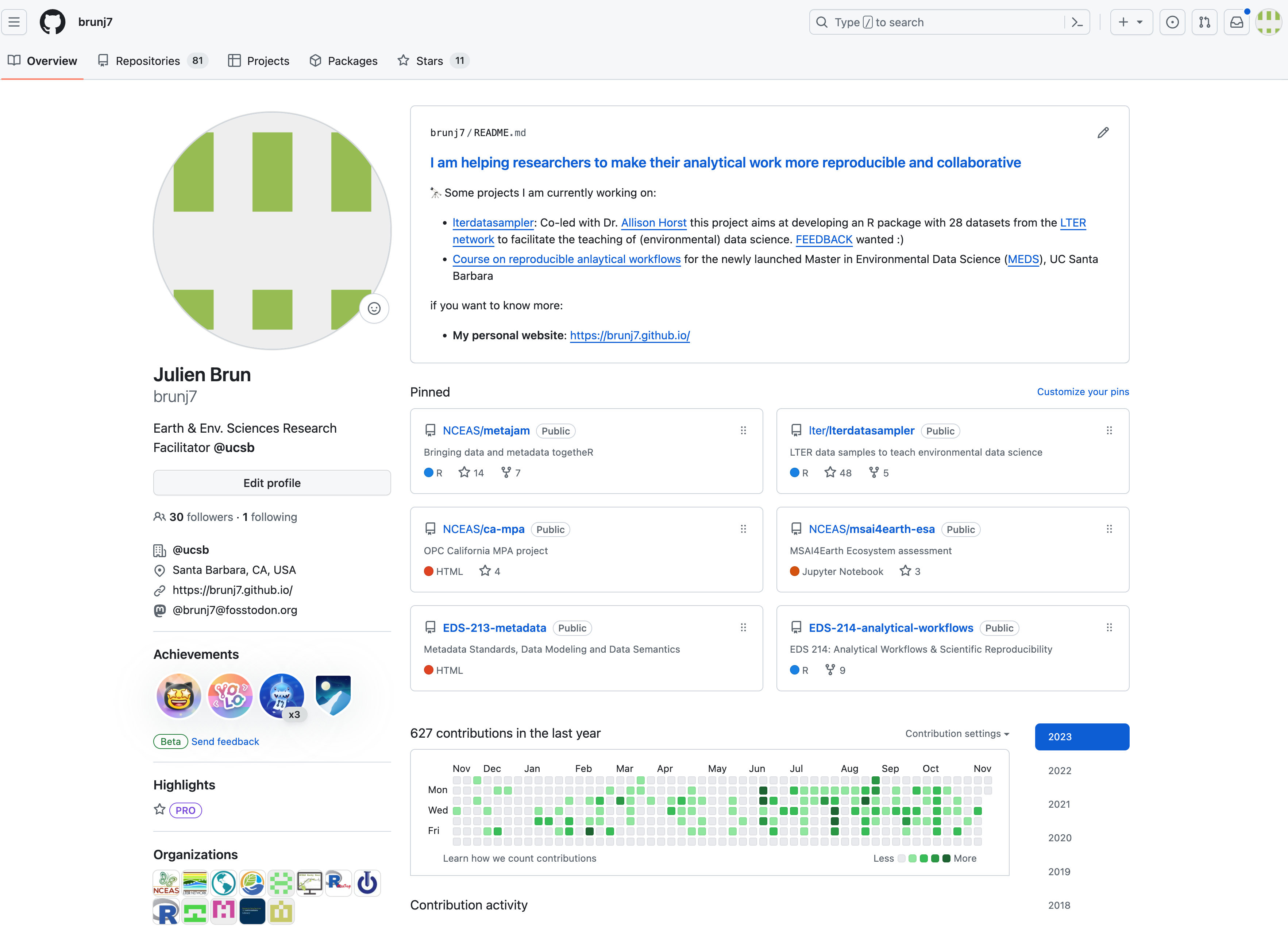This page can be reached using the following URL: https://github.com/username. For my user (brunj7) it would be: https://github.com/brunj7. It is a great space for you to provide some information about yourself and the main repositories you are working on. It also lists the GitHub Organizations you are part of. But more importantly, Users own repositories to host and share their code. You can list repositories from a User by clicking on the repositories tab in the main GitHub menu bar at the top.