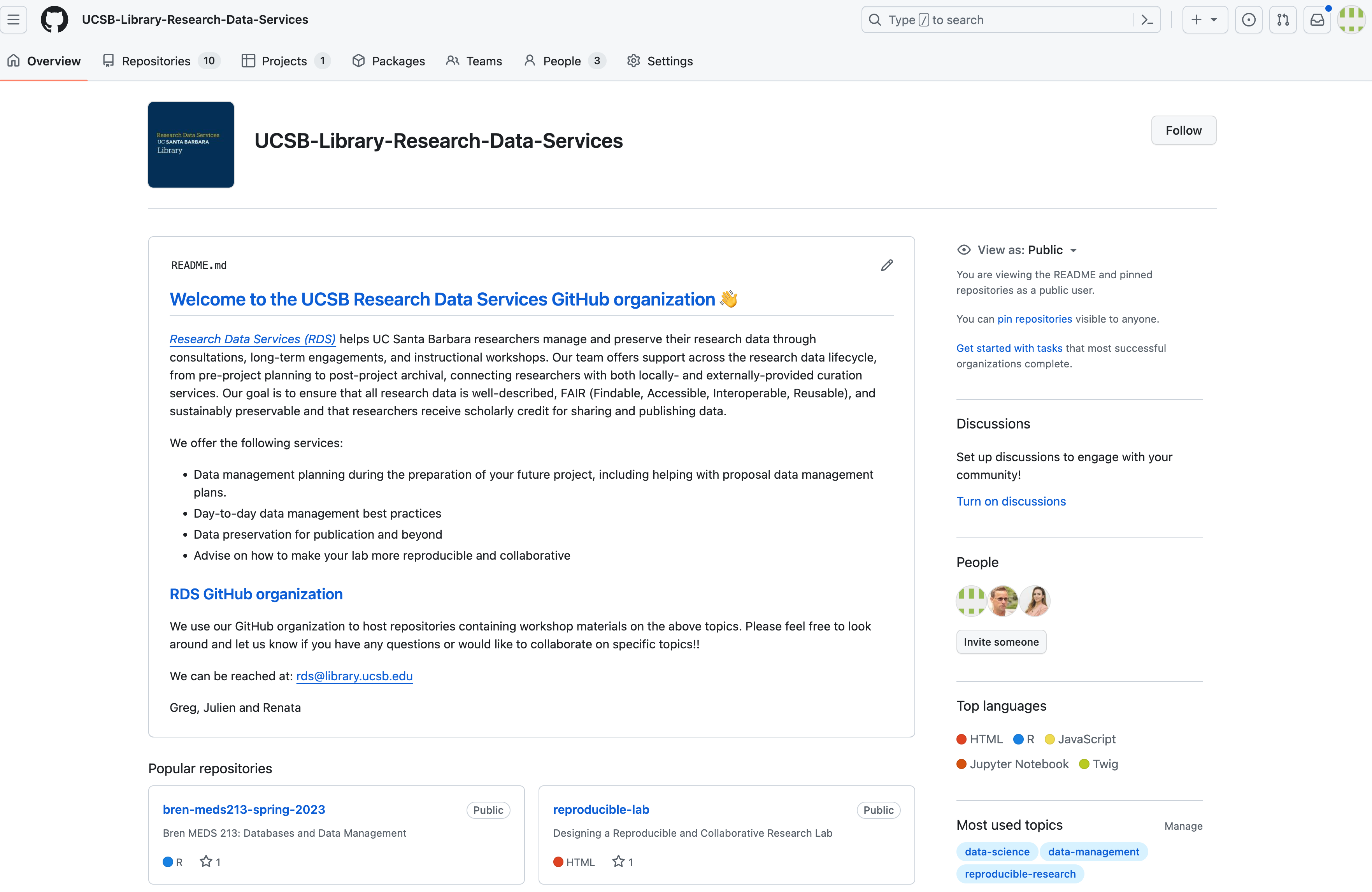- An organization account: https://github.com/UCSB-Library-Research-Data-Services
