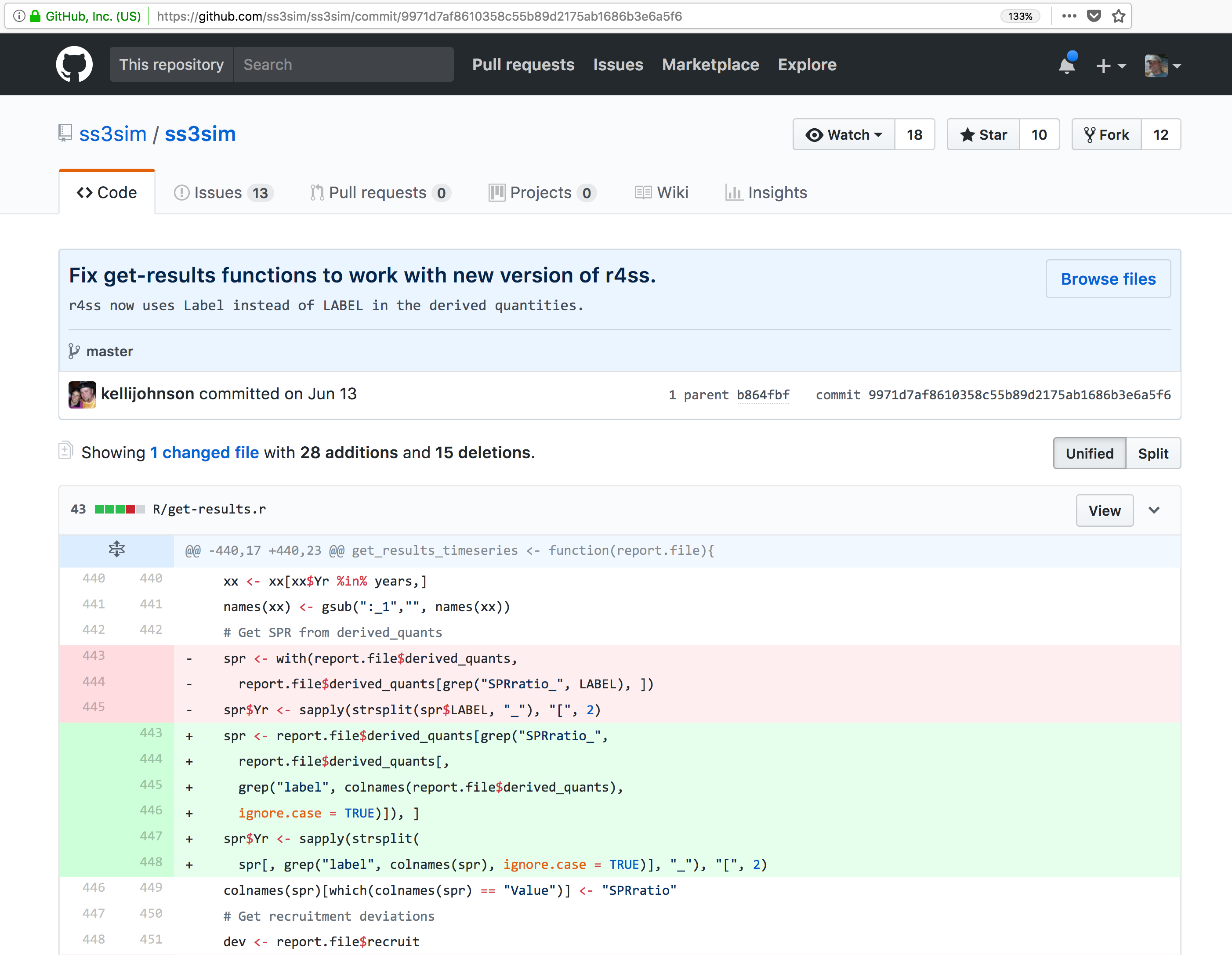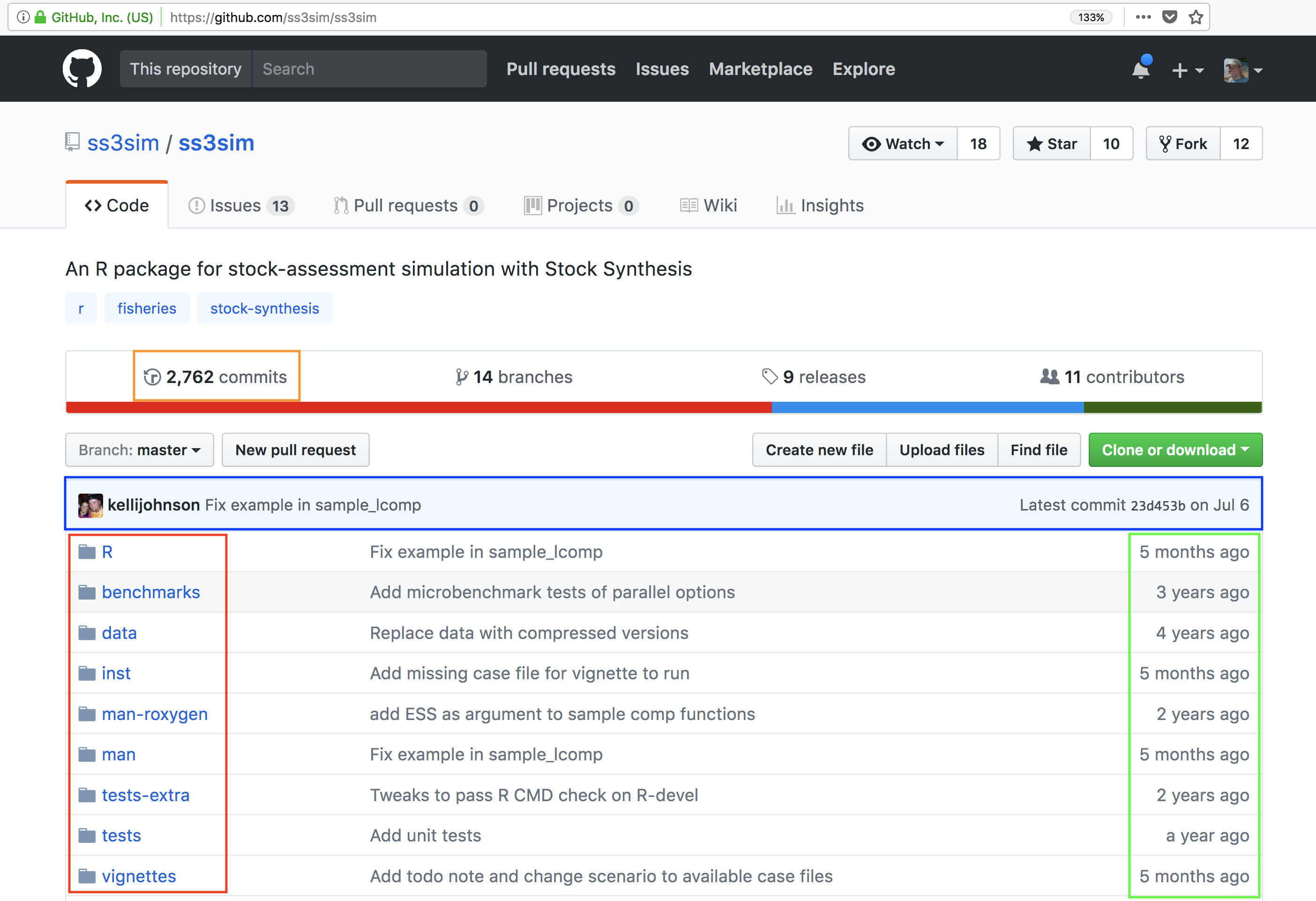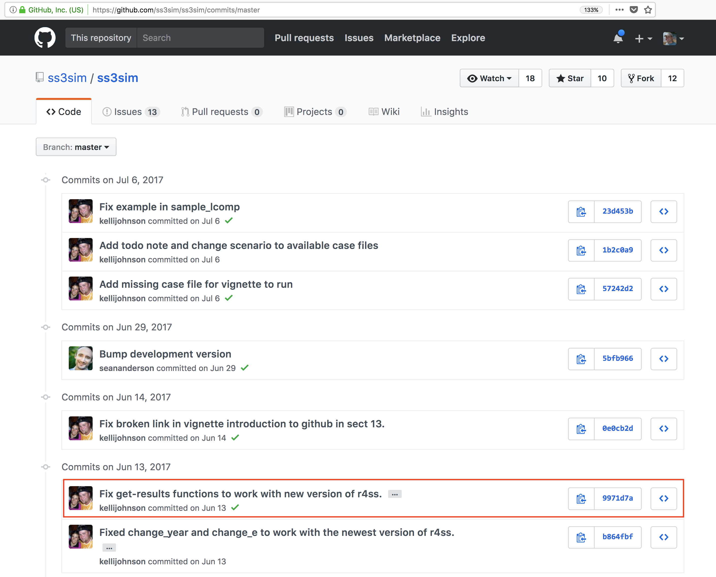 If we drill into the “commits” for the repository, we can see the history of changes made to all of the files. Looks like kellijohnson and seananderson were fixing things in June and July: