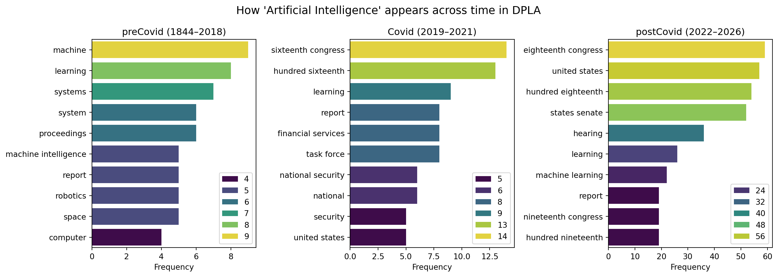 We can see a significant increase in the number of items in the “postCovid” period compared to the earlier periods. This reflects the AI boom that has been happening in recent years—which was likely accelerated (though not solely caused) by the COVID-19 pandemic.