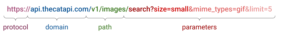 The third part of an endpoint is the path. This piece of the endpoint specifies the resource we want to access. This could be a specific set of data, for instance, a list of cat breeds, but it could also be an action to be performed, for instance, searching. The path can also specify the version of the API that is being used, for instance, “v1” or “v2”.