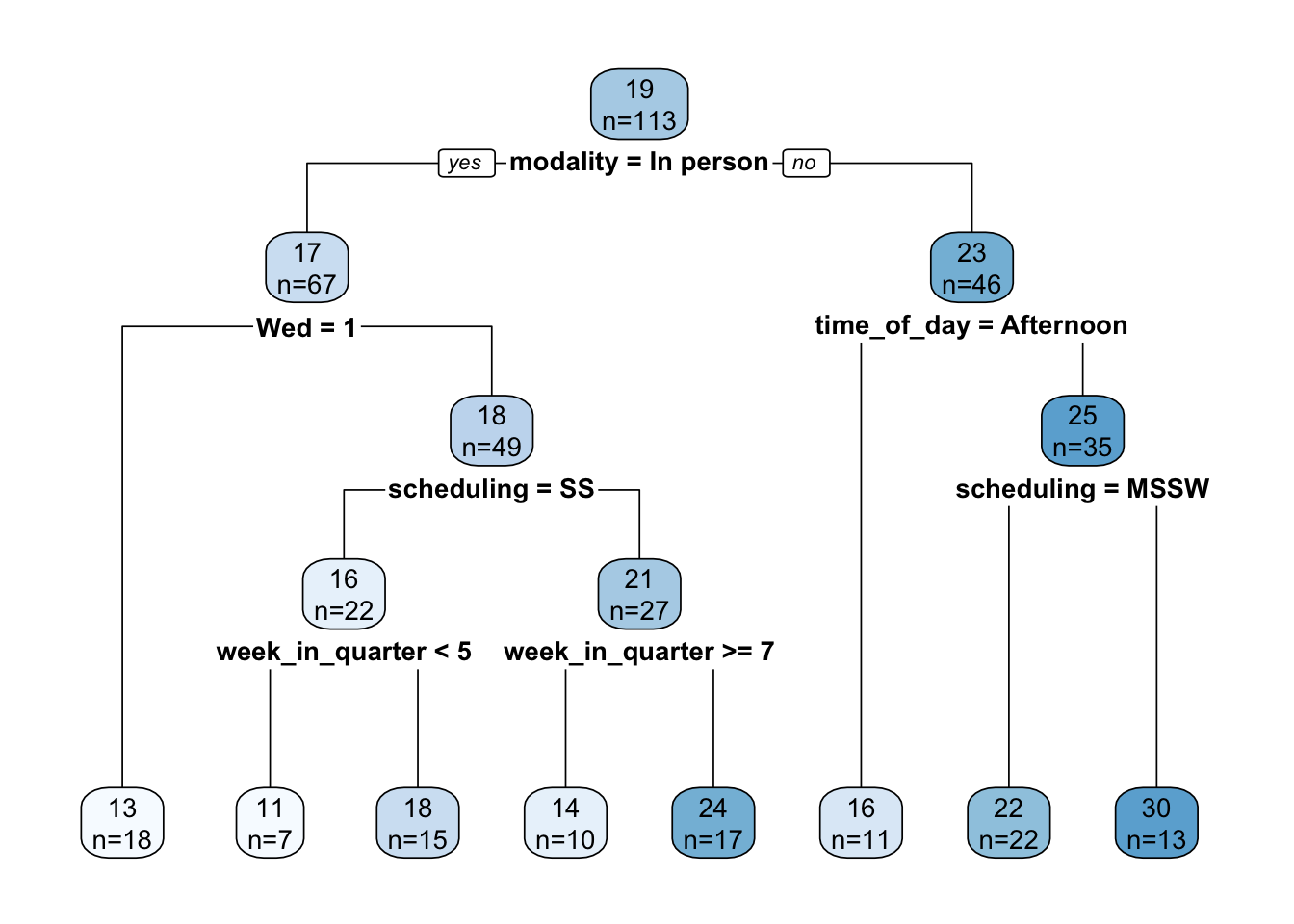 An advantage of a decision tree is its explanatory ability. Caution must be used here, though, as the trees are not stable, but can vary wildly with changes in the training set or just a change in the random number seed. In our case, it does seem consistent that the primary cut (i.e., the most important variable, on average) is modality, with the cut point being in person vs. not in person. Beyond that, it’s not clear that there are any universal rules. Specific choices of scheduling or week in quarter might or might not yield higher attendance, depending on prior conditionals. We explore this further below.
