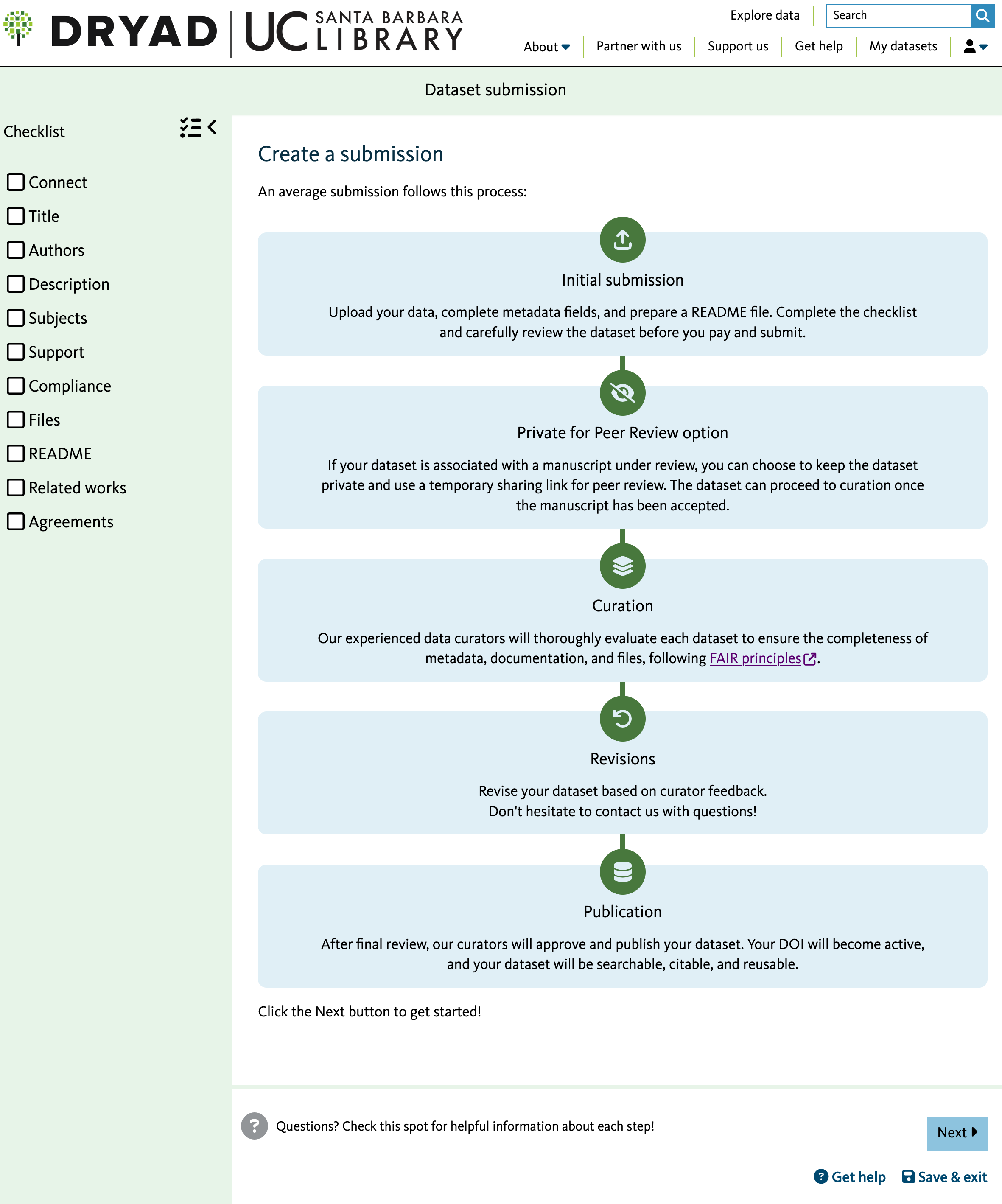 You are now ready to start the submission process!! Here we are going to use DRYAD as an example.