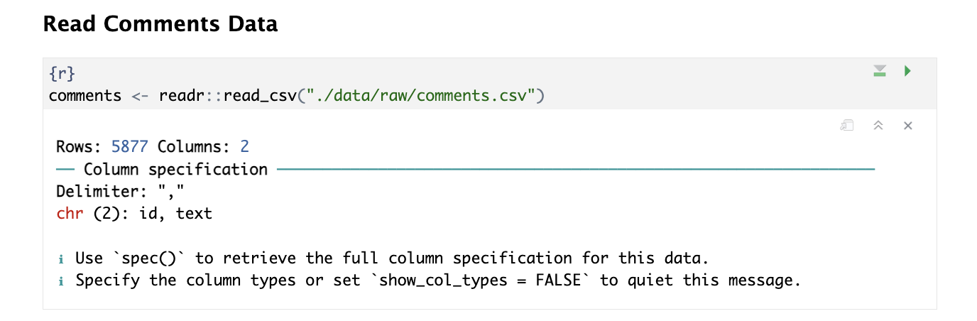 comments <- readr::read_csv("./data/raw/comments.csv")Which should show our dataset contains 5877 comments and two columns and display the comments dataset to our environment: