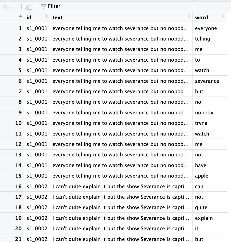 Let’s go back to our dataset and apply tokenization. We will use the `tidytext` function unnest_tokens(), which splits the text in a specified column into individual tokens (here, words), creating one row per token while keeping other data intact. The first argument (word) names the new column for tokens, and the second (text_cleaned) specifies the text column to tokenize. In short, it turns each word from text_cleaned into its own row in a new column called word in a new dataframe named tokenized.