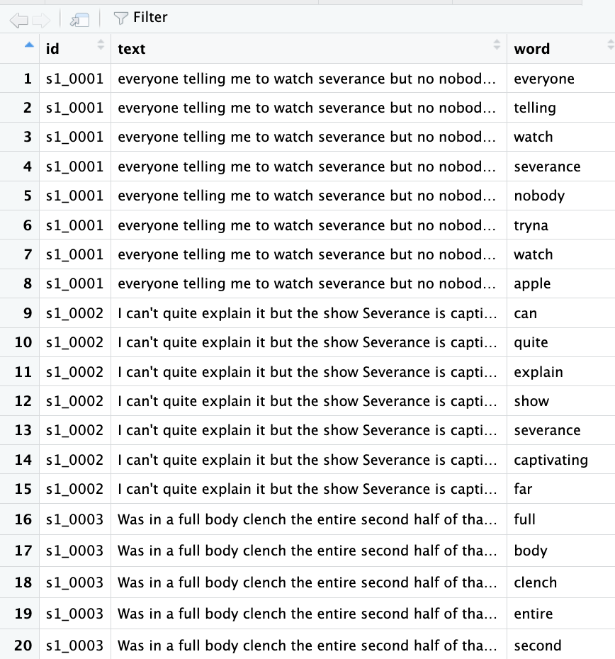 Then, we will apply the expression filter(lexicon == "snowball") to select the Snowball source (or lexicon). The double equal sign == it is a comparison operator which checks for equality.
