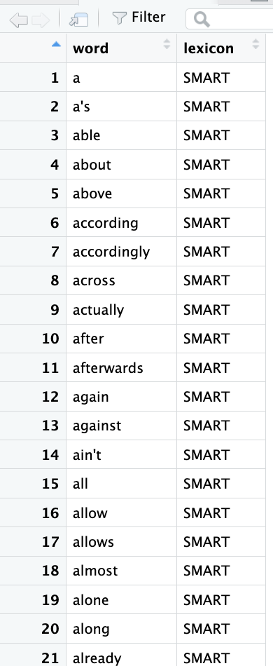 # Filter for Snowball stopwords only (less aggressive than SMART)