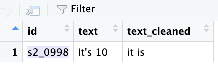 If you notice that the output object saved as comments_preprocessed contains one fewer row (observation) than the original dataset, this is because, after applying normalization and stopword removal with the Snowball Lexicon, the comment associated with ID "s2_0998" became an empty string.