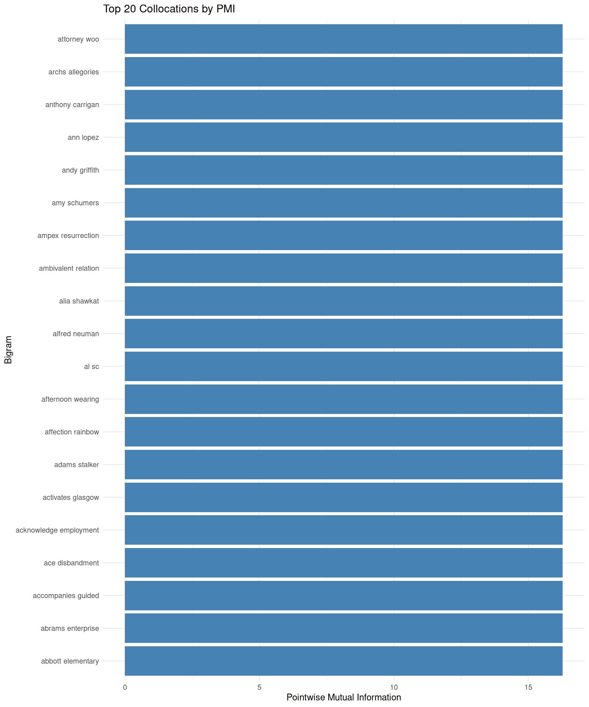 High PMI values indicate strong collocations, that means word pairs that appear together much more than chance would predict.