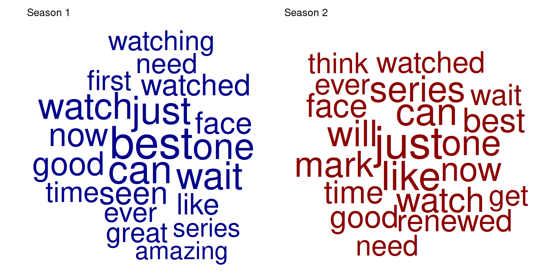 A simple but effective way to analyze text data is to compare word frequencies across different categories or groups. In this case, we can compare the word frequencies between different seasons of the show.