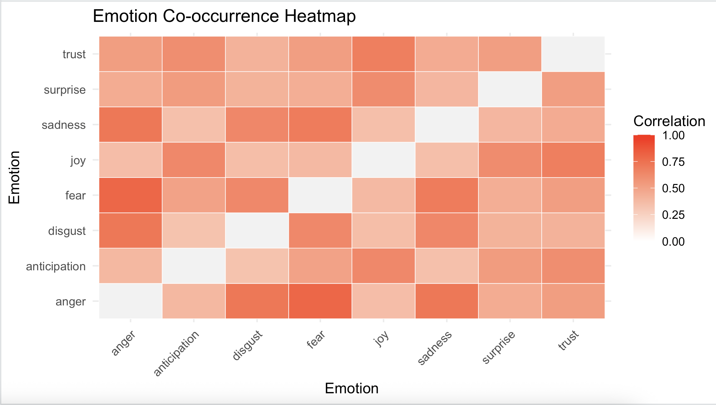 # Pearson correlation shows how strongly two emotions co-occur