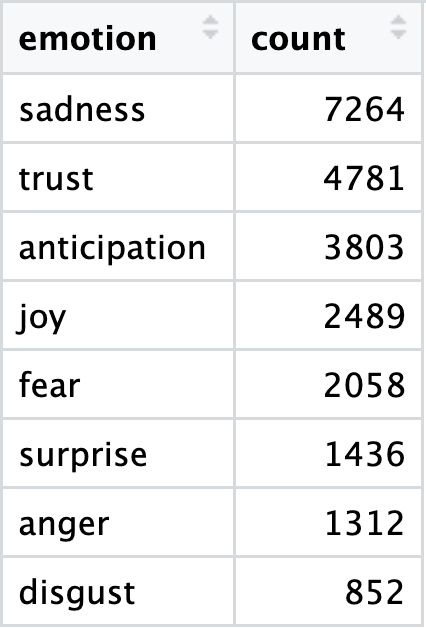 arrange(desc(count)) # sort emotions