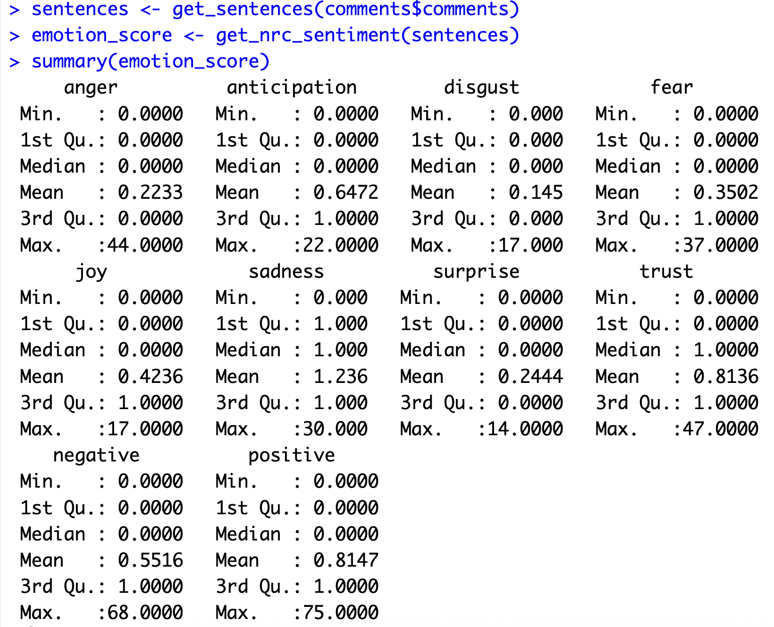 summary(emotion_score)This step should generate the following output: