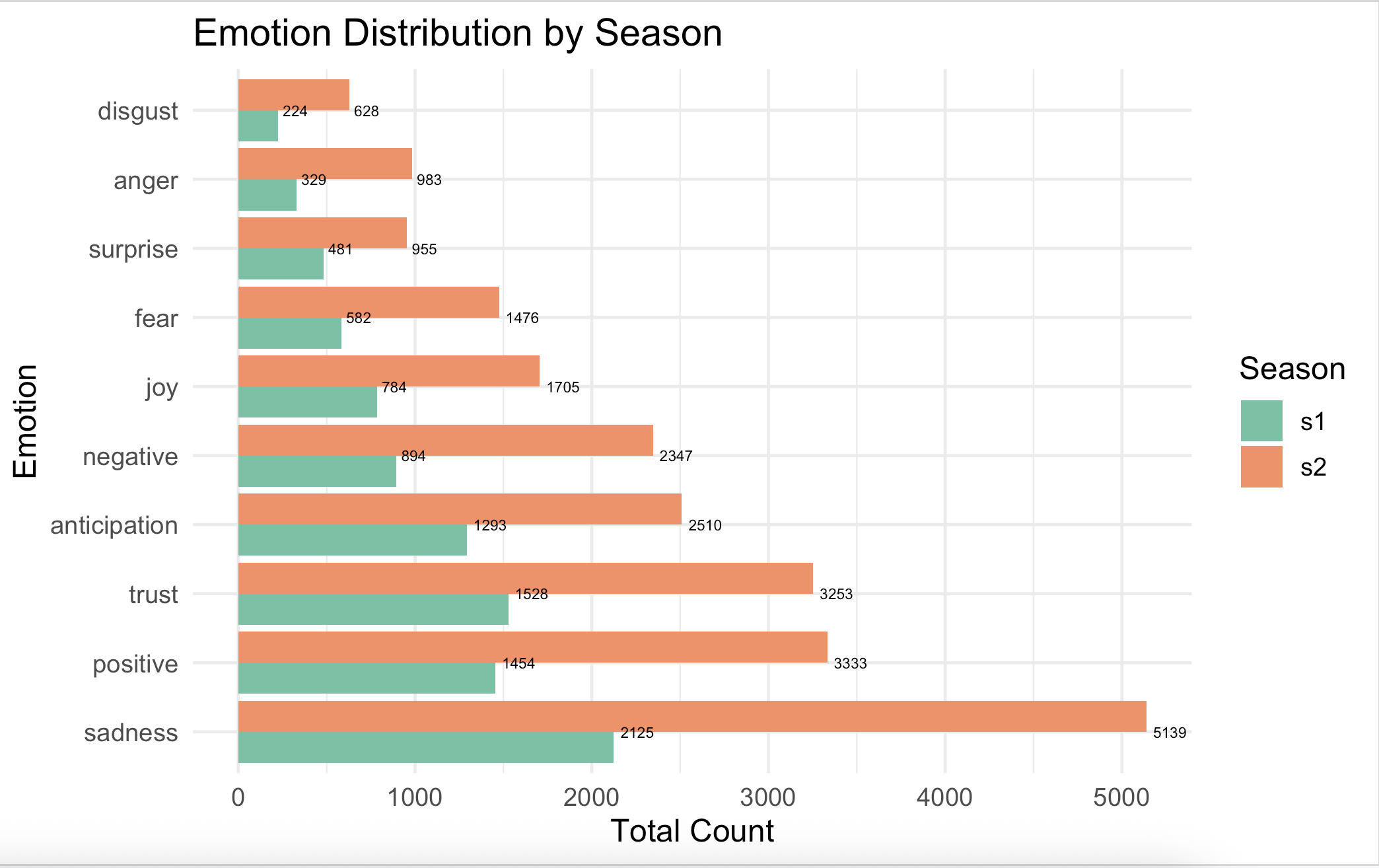 ifelse(grepl("^s2_", id), "s2", NA)))Time to aggregates the total count of each emotion within each season.